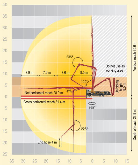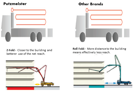 It is also possible for the boom to slip into structures of up to 10m in height if the machine is very close to the building. This creates a noticeably longer net reach. Thanks to its Z-Fold system, the M 36-4 is ready to place concrete in no time, as not all of the arms need to be unfolded before pumping begins.